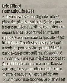 Un nouveau challenge était au programme pour moi, j'étais très content d'être au départ de mon troisième Tour de Corse. La Team PadoRacing nous a fait confiance pour prendre le volant de la DS3 R3T, avec à mes côtés l'expérimenté Roche Yannick (copilote d'Erik Comas). Un très beau rallye qui s'est très bien passé, à part une crevaison dans la Power Stage, on finit 2ème des insulaires.